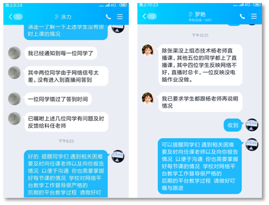 学院工作群及时传达学校各方面工作信息和学院的工作任务,领导深入到各个“群课堂”,随时了解课程的教学情况,发现困难及时沟通并给予支持。开学前两周,机电系杨可老师通过学生网上签到和学习情况,发现所带班级有16名同学没有正常到课,及时向学院反馈。学生科赵永峰老师即刻组织辅导员罗艳和涂力两位老师进行细心排查,及时发现问题并对学生进行了提醒。