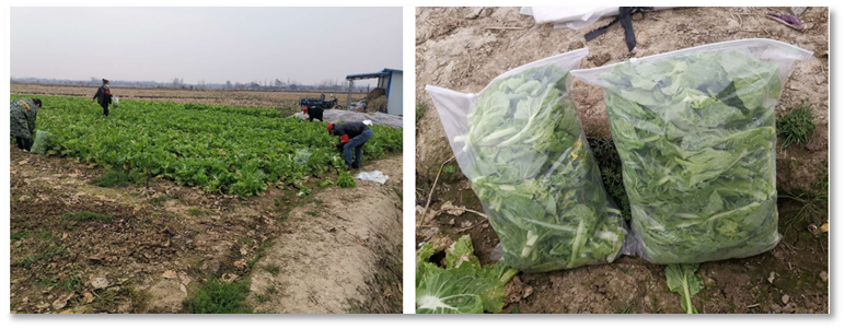 刘作鹏老师在家乡农田摘菜,收集村民捐菜捐物并分派发放