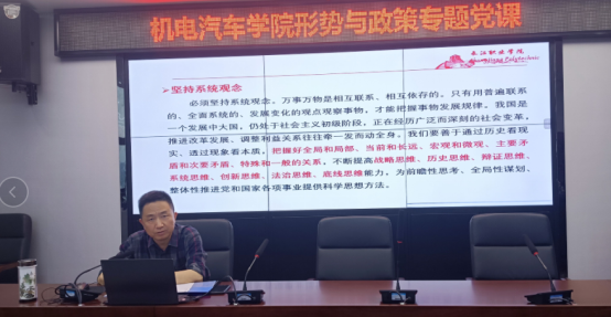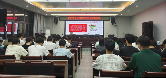 本网讯 为深入贯彻落实党的二十大精神,进一步推动习近平新时代中国特色社会主义思想进教材、进课堂、进头脑,坚持用习近平新时代中国特色社会主义思想铸魂育人。2023年4月19日晚,党委委员、副校长龚谦深入机电汽车学院为学生讲授形势与政策专题党课。