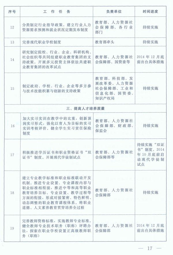 (十五)推进人才培养模式创新。坚持校企合作、工学结合,强化教学、学习、实训相融合的教育教学活动。推行项目教学、案例教学、工作过程导向教学等教学模式。加大实习实训在教学中的比重,创新顶岗实习形式,强化以育人为目标的实习实训考核评价。健全学生实习责任保险制度。积极推进学历证书和职业资格证书“双证书”制度。开展校企联合招生、联合培养的现代学徒制试点,完善支持政策,推进校企一体化育人。开展职业技能竞赛。