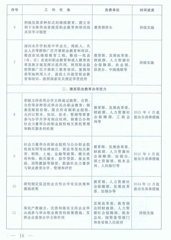 ——加强统筹、分类指导。牢固确立职业教育在国家人才培养体系中的重要位置,统筹发展各级各类职业教育,坚持学校教育和职业培训并举。强化省级人民政府统筹和部门协调配合,加强行业部门对本部门、本行业职业教育的指导。推动公办与民办职业教育共同发展。