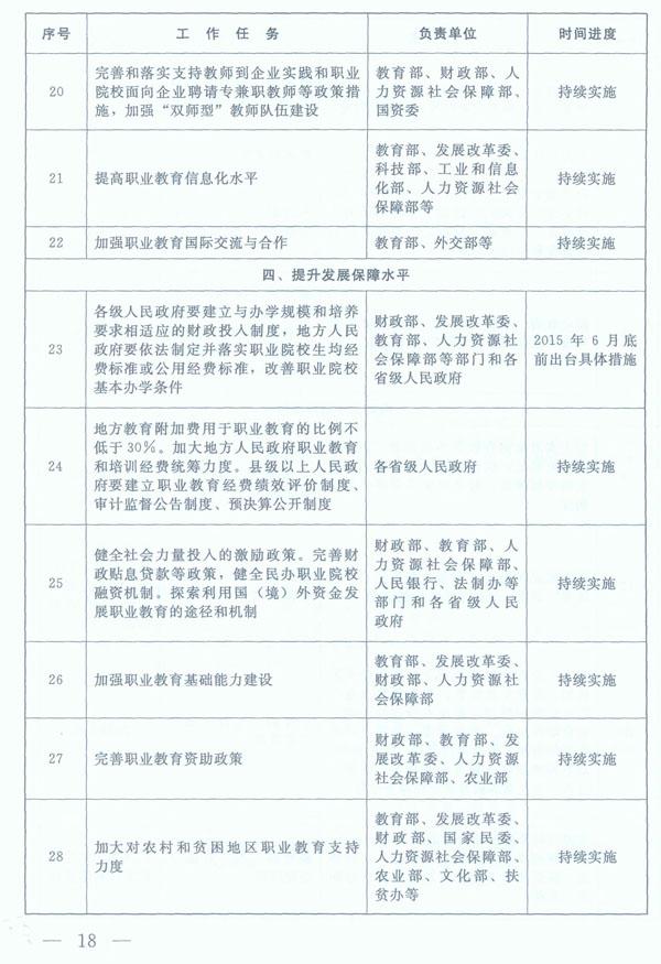 (二十六)落实政府职责。完善分级管理、地方为主、政府统筹、社会参与的管理体制。国务院相关部门要有效运用总体规划、政策引导等手段以及税收金融、财政转移支付等杠杆,加强对职业教育发展的统筹协调和分类指导;地方政府要切实承担主要责任,结合本地实际推进职业教育改革发展,探索解决职业教育发展的难点问题。要加快政府职能转变,减少部门职责交叉和分散,减少对学校教育教学具体事务的干预。充分发挥职业教育工作部门联席会议制度的作用,形成工作合力。