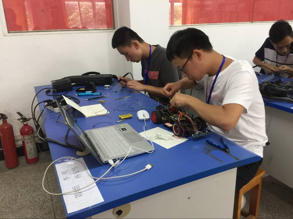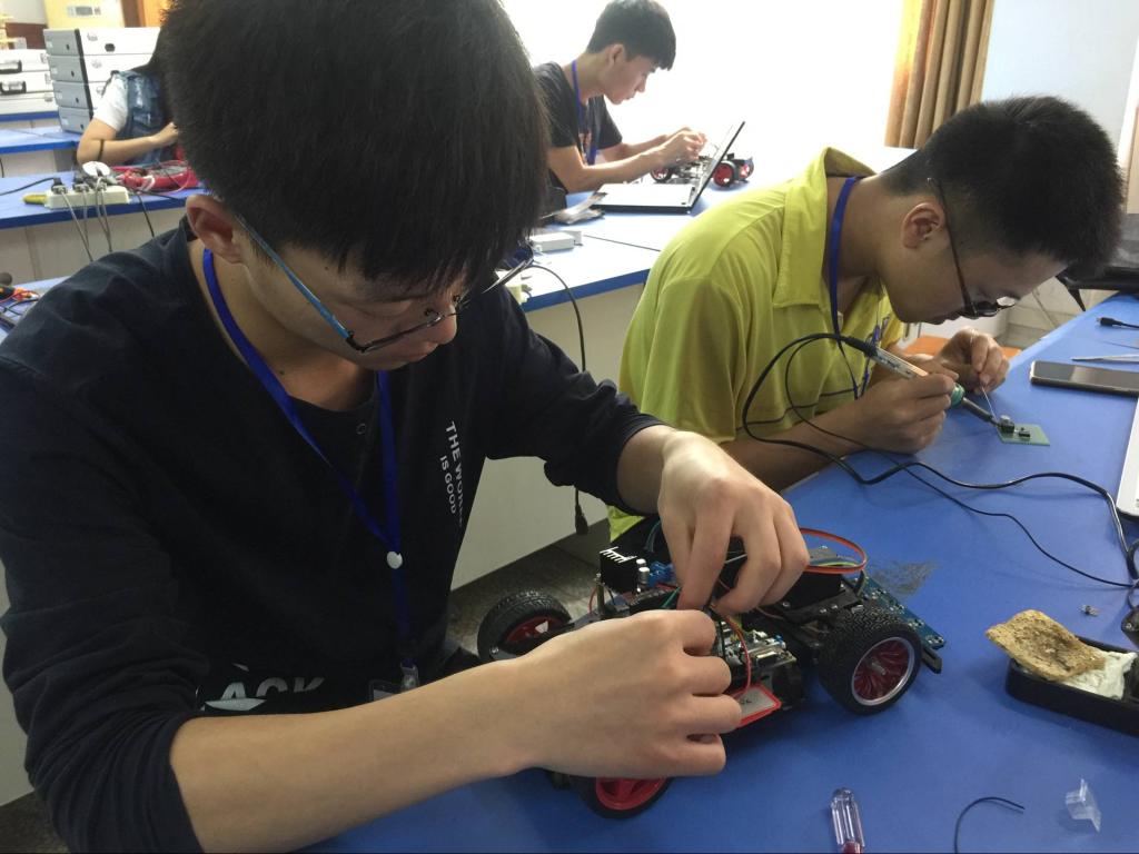 该赛项初赛共有电信系16级、17级两个年级三个专业的36名同学参加,经过初赛的选拔,分别有12位同学入围决赛。决赛以团队形式进行,学生在2小时内完成智能小车的装配、连线、焊接电路、编程、下载、测试等完整流程,最终达到智能小车完成指定赛道循迹功能的要求展开,真实的体现出学生专业实操能力和分析解决问题能力。