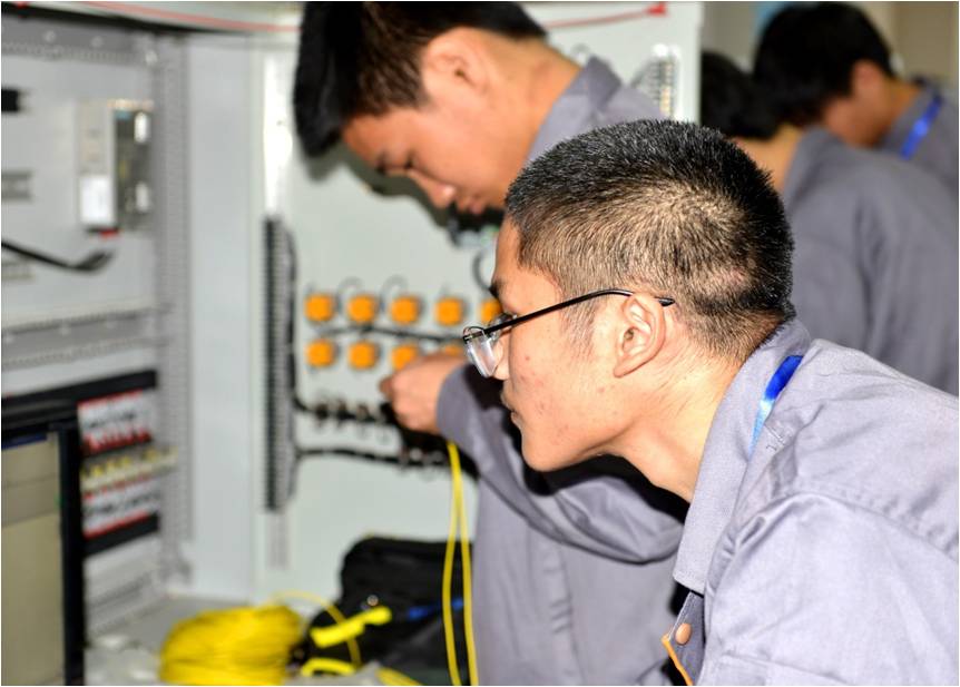 决赛现场要求每组选手在企业级的工作台在规定时间内完成相关赛项内容,企业专家根据学生完成情况现场打分,评出选手名次。据机电系杨可主任介绍,本次大赛内容以湖北省职业院校技能大赛中“电气系统安装与调试”赛项内容为参考,通过本次比赛既促进学生的学习热情与交流,也为参加下半年的省赛进行一次练兵。